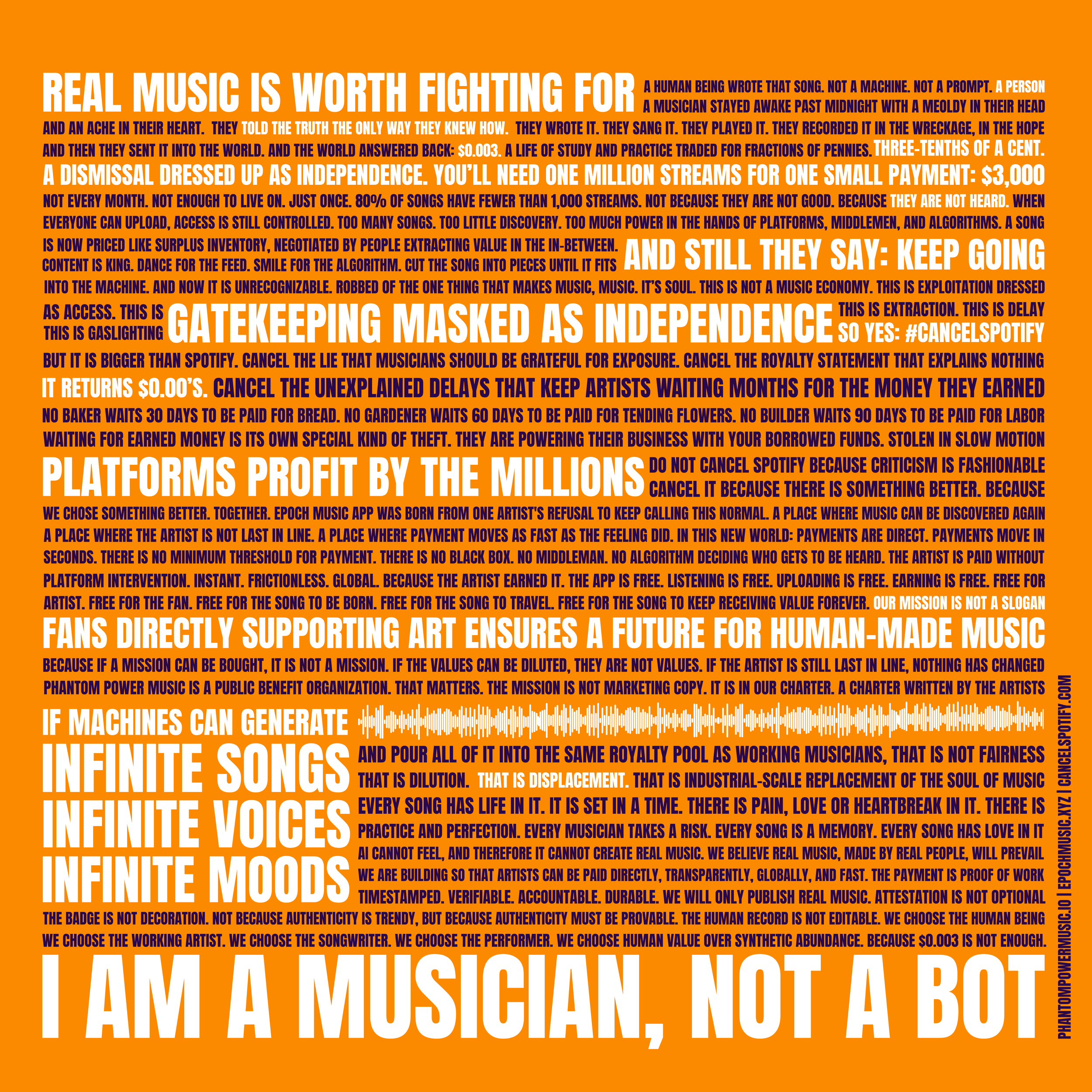 We’re musicians too. And we are tired of the math. Phantom Power Music was formed to protect the economic viability of human made music. We are a coalition of independent artists choosing economic autonomy over streaming dependency. We are building an artist equity organization with free tools for artists & their fans all mission designed to protect the long term viability of human made music.