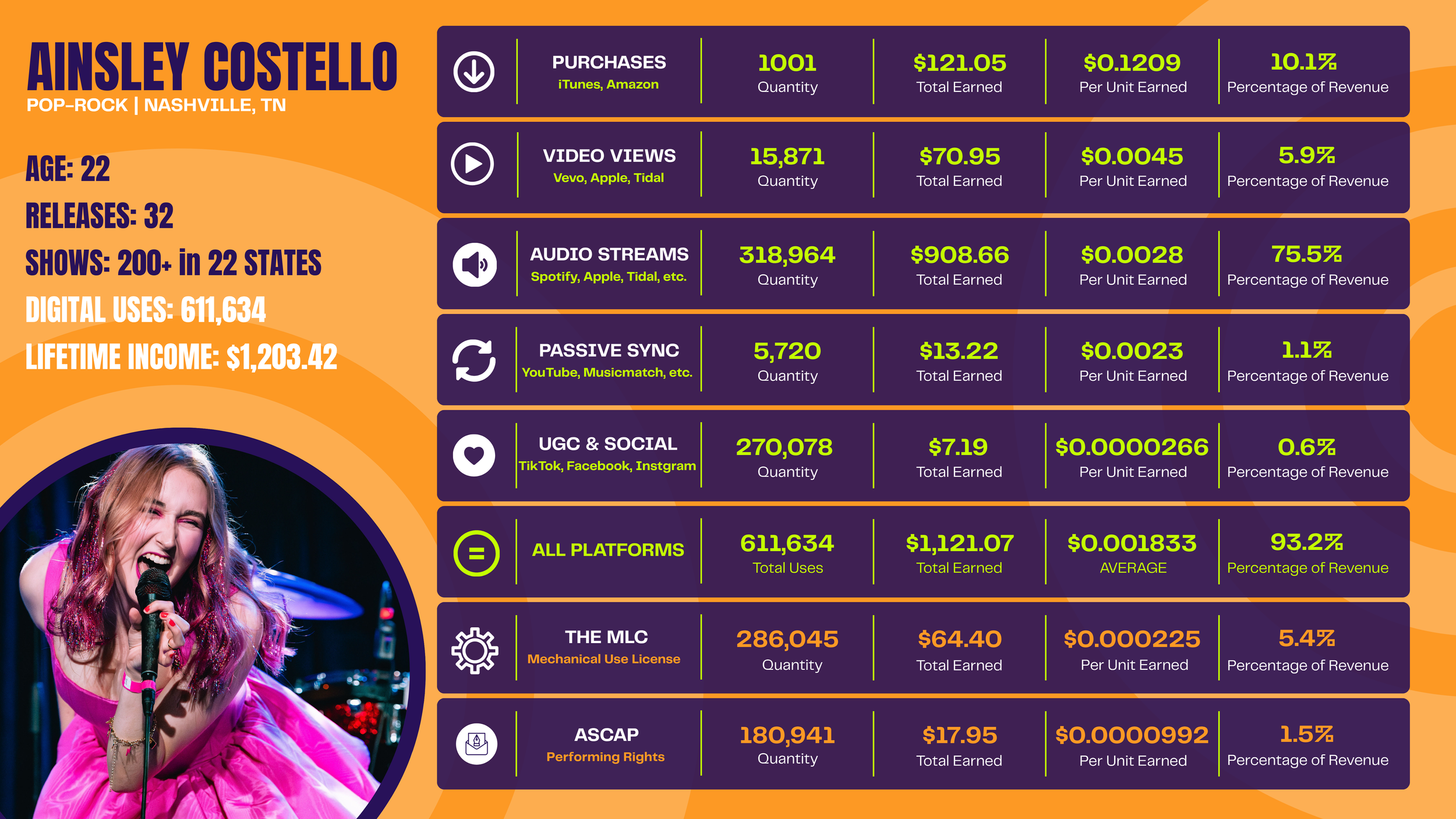 **Ainsley’s music was used 611,634 times and paid $1,203 total - over 6 years. If every use returned just $1, that’s over $611K. Imagine any other business being told that’s acceptable. No baker sells it’s bread for less than it costs to make. This would be unacceptable in any other industry.